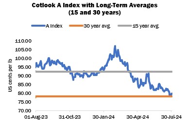Under the lead of New York futures, international cotton prices as measured by the Cotlook A Index declined overall during July. The Index reached its lowest point since December 2020 on July 29, at 78.35 cents per lb. The high point for the season of 107.00 cents per lb (well above long-term averages) was reached at the end of February.