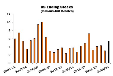 As expected, the Department increased its domestic production figure for 2024/25 by one million bales (480 lbs) to 17 million in its July supply and demand bulletin, in line with the higher area figure reported in the previous month’s Planted Acreage report. Since exports were unchanged and beginning stocks were revised upward, the forecast of US ending stocks in 2024/25 was raised substantially, from 4.1 to 5.3 million bales. That would be the largest carryover since the Covid-affected 2019/20 season and the second highest of the past fifteen years.