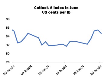 International cotton prices as measured by the Cotlook A Index declined modestly during June. In the middle of the month, the A Index fell to its lowest position since December 2020, before regaining some ground to end the period at 84.70 cents per lb, a reduction of 210 cent points from the end of May.