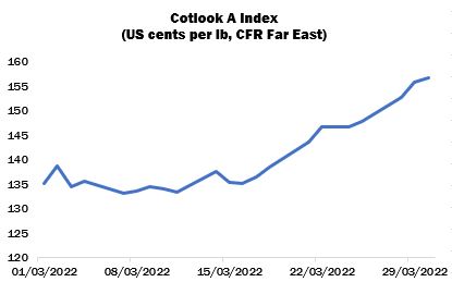 International cotton prices resumed their upward trajectory in earnest during the second half of March, prompted by a dramatic rise in New York futures. The Cotlook A index fell to its low point of 133.15 US cents per lb early in the period, and rose to 156.55 on the last day of the month, its highest level since June 2011.