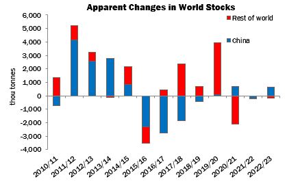 Taking the above adjustments into account, world stocks by the end of the current season are expected to decrease by 219,000 tonnes. Conversely, Cotlook envisages an increase of global stock levels by July 31, 2023, of 465,000 tonnes.