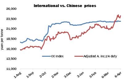 The relationship between Chinese and international prices (as measured by comparing the CC Index with the A Index adjusted to local terms) underwent a transformation during March. Whereas for many months the latter value had traded at a significant discount to Chinese offering rates, late in the month that dynamic was reversed, and by March 31 import offers had moved to an equivalent premium of almost 11 US cents per lb.