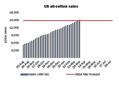 That being said, China continued to appear as the major destination in United States export sales reports released during March. Net additions to the overall commitment remained robust, and by mid-month had already exceeded Washington’s projection for the season (14.75 million statistical bales of 480 lbs). Shipments maintained the improvement observed since late January and registered a marketing-year high in the week ended March 17. However, with that exception, export numbers were well behind the average required to meet USDA’s projection.