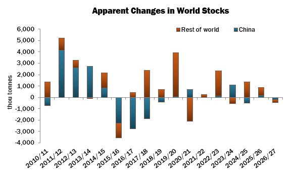 The increase to global stock levels by August 31, 2026 is now projected at 1,000,000 tonnes, down from 1,060,000 in February.