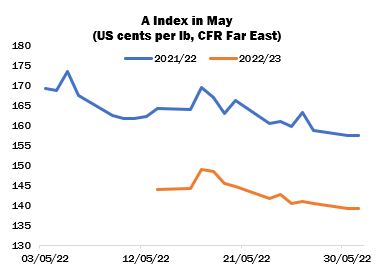 May 13 saw the introduction of the Forward (2022/23) Cotlook A Index, around a month later than last year. That price reflects cotton for shipment no earlier than October/November. The initial value, at 144 US cents per lb, represented a discount of over 20 cents in relation to the Current Index on the same date. The differential had narrowed only slightly by the end of the period, to 1,820 cent points. The inverted July/December spread in New York fluctuated erratically during May, ranging from 1,529 to 2,498 cent points (based on closing values).