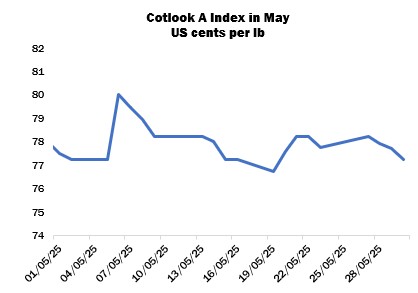 International cotton prices, as measured by the Cotlook A Index, strengthened early in May before moving lower again to end the month at 77.25 cents per lb, a fall of 75 points overall.