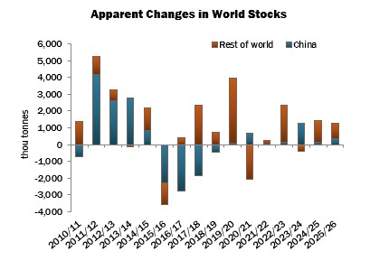 For 2025/26, our consumption forecast was also lowered, by 525,000 tonnes, to 24.42 million. Reductions were noted for China, Pakistan and India. Global output was raised by 371,000 tonnes, as increases for China, the United States, and others were partially offset by a decrease for Pakistan. Therefore, the margin by which production is forecast to exceed consumption in the next marketing year has increased to 1.25 million tonnes.