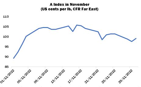 International cotton prices moved in a wide range during November, influenced by sharp fluctuations in New York. The Cotlook A Index began the period at its low point of 89.20 US cents per lb, and climbed to a high of 105.75 cents mid-month, before edging lower to end slightly below the dollar mark.