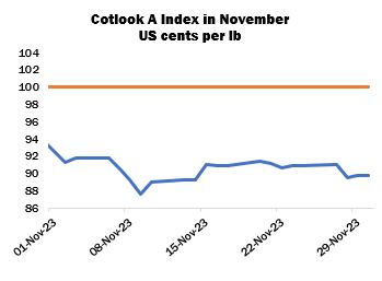 In China, procurement from the international market slowed as the gap between domestic and world prices narrowed. An ample local supply – the domestic crop has been steadily arriving at gins, while imported lots consigned at ports were also available –affected sentiment. The country nonetheless accounted for 58 percent of the 2023/24 upland export registrations as reported by the USDA between October 26 and November 23 (738,100 running bales out of a total of 1,263,400), but Vietnam replaced China as the largest destination in the last report of that period. Purchasing by the State Reserve also continued to be a focus of discussion – as mentioned in October’s summary, the proportion of buying versus selling this year is estimated to be about balanced. Although stocks may not yet be at an optimal level (from Beijing’s perspective), it would seem that for now at least, import buying may have paused.