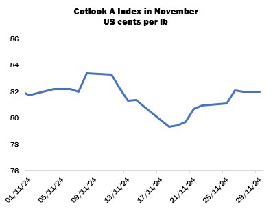 International cotton prices, as measured by the Cotlook A Index, stood at 82.05 cents per lb on November 29, marking a decline of just five points from the end of the previous month. In New York, the March contract closed 10 points higher than at the end of October, as a bearish trend in the middle of the period was reversed, with modestly higher settlements in eight of the last nine sessions under review. The lead contract’s high point for the month was 73.43 cents per lb, on November 7, while the low proved to be 68.91 on the fifteenth.