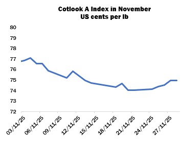 International cotton prices as measured by the Cotlook A Index followed a largely downward trajectory last month, reaching a low point of 74.00 cents per lb on November 20, a level not seen since October 2020, and losing 150 cent points overall. In New York, the December delivery made new contract low closes as it approached its expiry, as did the now lead March contract (of 63.74 cents per lb), although a modest recovery then followed. Record daily volumes were traded earlier in the month as positions were rolled from December to March, while open interest remained robust, peaking at 311,545 contracts on November 6.