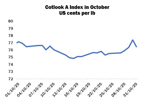 Meanwhile, President Trump threatened 100-percent tariffs on China in reaction to Beijing’s announcement of tighter controls on rare earth exports, which was followed by the addition of port charges for ships registered in the opposing countries. Despite the escalating hostilities, reports circulated that Xi and Trump were still set to meet in South Korea during the Asia-Pacific Economic Cooperation Summit in late October. Bullish trends were observed across many markets, including cotton futures, in the run up to the meeting as observers anticipated a trade deal, but the outcome failed to live up to most expectations. In the event, duties on Chinese products entering the US were reduced by ten percent, but remained high at perhaps an average of 47 percent, while Beijing was said to have agreed to restart purchases of US soybeans after a longstanding pause. Comments from the US President implied that other farm products may also be included in arrangements, but cotton was not mentioned specifically.