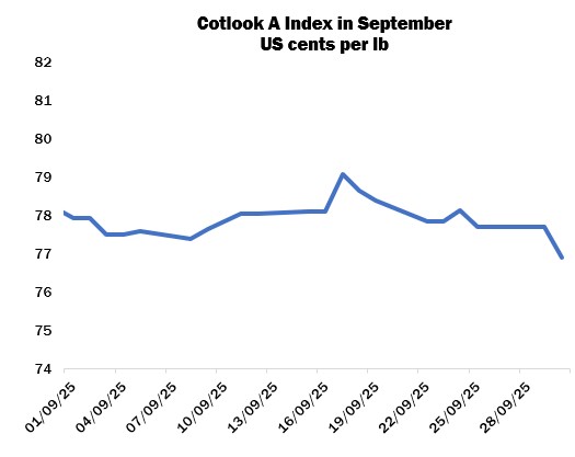 Cotton Outlook’s forecast of world raw cotton output in 2025/26 was lowered by 82,000 tonnes in September, to just under 25.9 million, as additions for China, India, and the United States were more than offset by reductions in various other countries. A modest upward adjustment was made to the 2024/25 estimate overall.