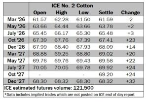 ICE No. 2 cotton settles mostly on modest gains