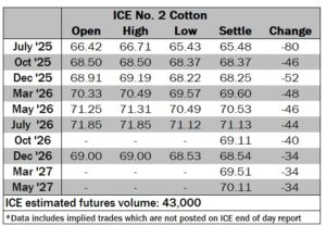 ICE No. 2 cotton settles lower