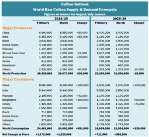 In the week ended March 20, the net upland sales commitment rose by 84,400 running bales, attributed mainly to Pakistan (35,300 bales), Vietnam (18,900), Turkey (16,900), Bangladesh (14,600) and Thailand (9,600). Reductions were noted for China (27,000), Mexico (2,800), …