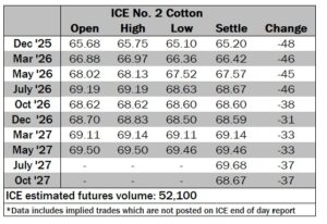 ICE No. 2 cotton settles moderately lower