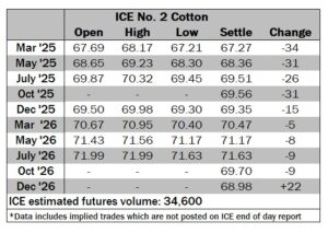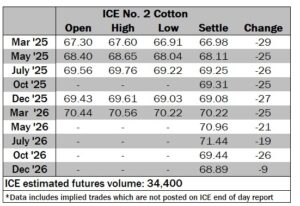 ICE No. 2 cotton settles lower