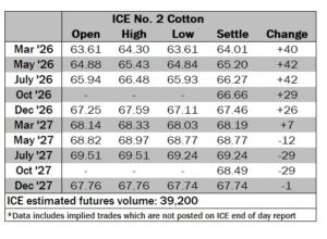 ICE No. 2 cotton settles mostly on positive note