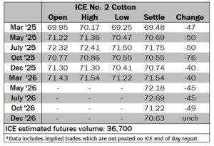 ICE No. 2 cotton settles moderately lower