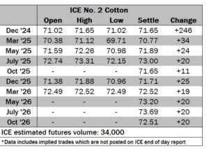 ICE No. 2 cotton settles on gains