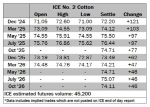 ICE No. 2 cotton settles higher