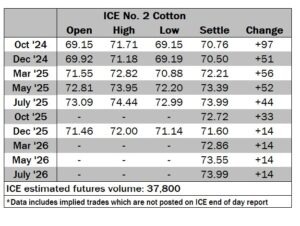 ICE No. 2 cotton settles moderately higher