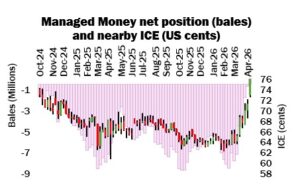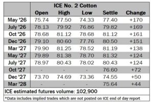 ICE No. 2 cotton settles on tripe-point gains