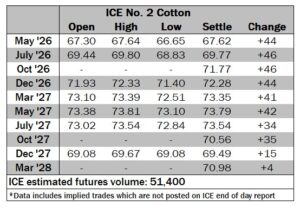 ICE No. 2 cotton settles to the upside