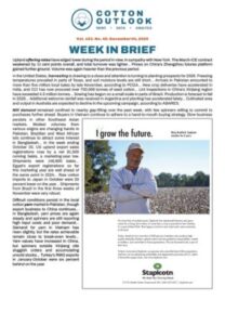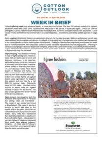 COTTON OUTLOOK is a weekly round-up of the news and statistics from major cotton markets inc. US, China, India, Pakistan, Bangladesh, Far Eastern Markets, Brazil etc. and can be purchased directly from this page.